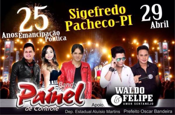 A prefeitura de Sigefredo está trazendo duas atrações para comemorar em praça publica o aniversario da cidade e festa do trabalhador, as bandas Painel de Controle e Waldo & Felipe estarão animando as festividades no município que esta completando 25 anos.