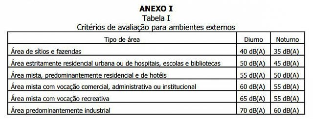(Tabela com critérios legais adotados no país para medição de volume sonoro)