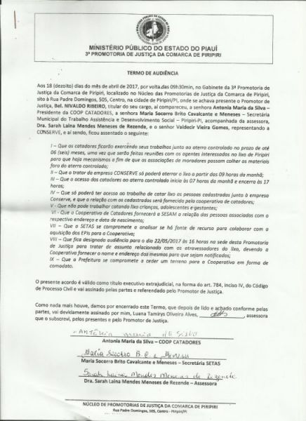 Em audiência no Ministério Público, no dia 18 de abril, foi acordado que os catadores ficarão exercendo seus trabalhos no prazo de até 6 meses e após esse prazo serão criados mecanismos para que haja a coleta fora do aterro controlado.