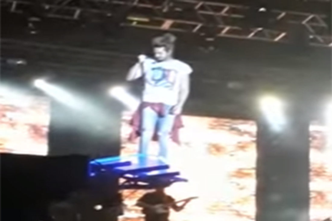 Imagens gravadas pelos fãs mostram o momento em que ele tenta descer de uma estrutura elevada e acaba caindo.