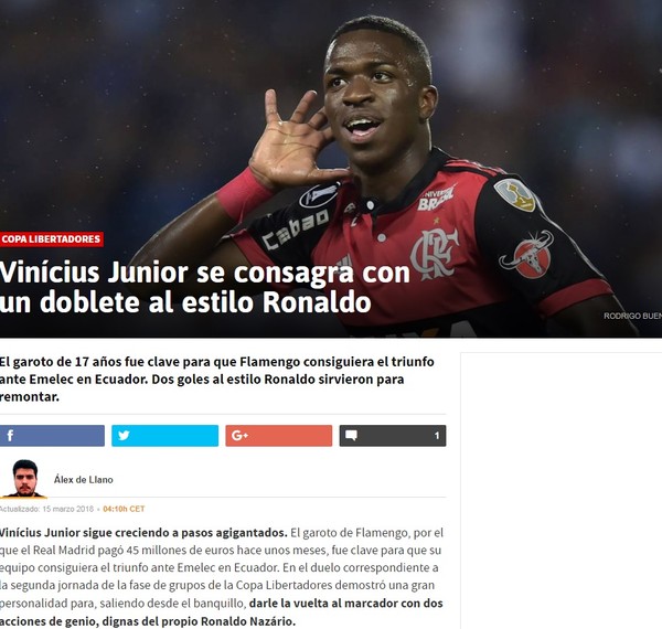 "Ações de gênio, dignas de Ronaldo Nazário". Assim escreveu o jornal espanhol As sobre a exibição de Vinicius Junior na noite desta quarta-feira, na vitória do Flamengo por 2 a 1 diante do Emelec, de virada, no Equador.