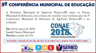 A Secretaria Municipal de Educação do município de Sigefredo Pacheco, por meio do secretário Murilo Bandeira e do prefeito municipal, Oscar Bandeira, realizará nesta sexta-feira (23/03) a 3° Conferência Municipal de Educação com o objetivo de discutir e melhorar as estratégias educacionais além de compreender e celebrar os avanços no município.