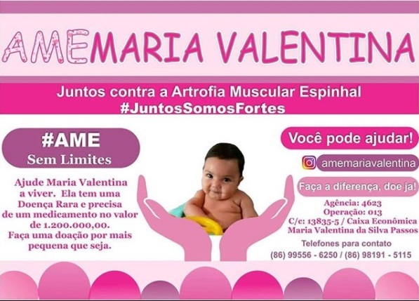 A jovem Maria Valentina foi diagnosticada com Atrofia Muscular Cerebral (AME) que se caracteriza como uma situação em que o cérebro sofre uma redução de seu volume devido à morte parcial de suas células, os neurônios, afetando suas capacidades para realizar as atividades diárias de aprendizagem e de memória.