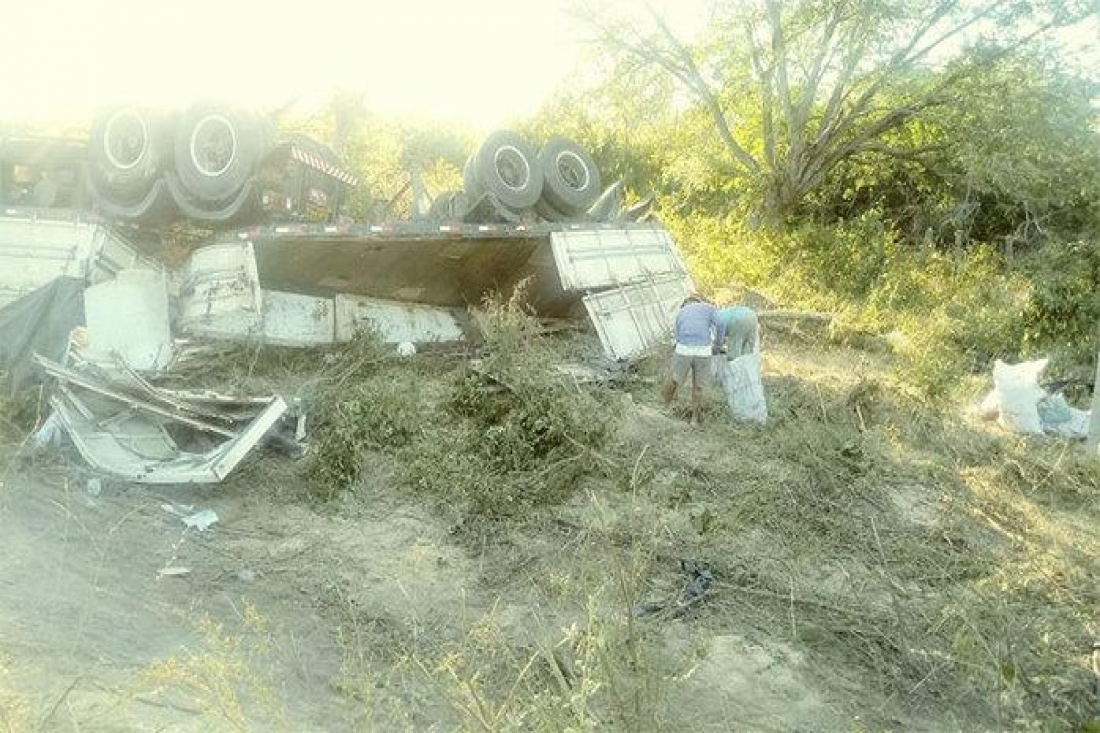 Uma carreta carregada de farelo soja tombou na BR-343, em Floriano. O motorista perdeu o controle do veículo na curva, tendo apenas ferimentos leves.