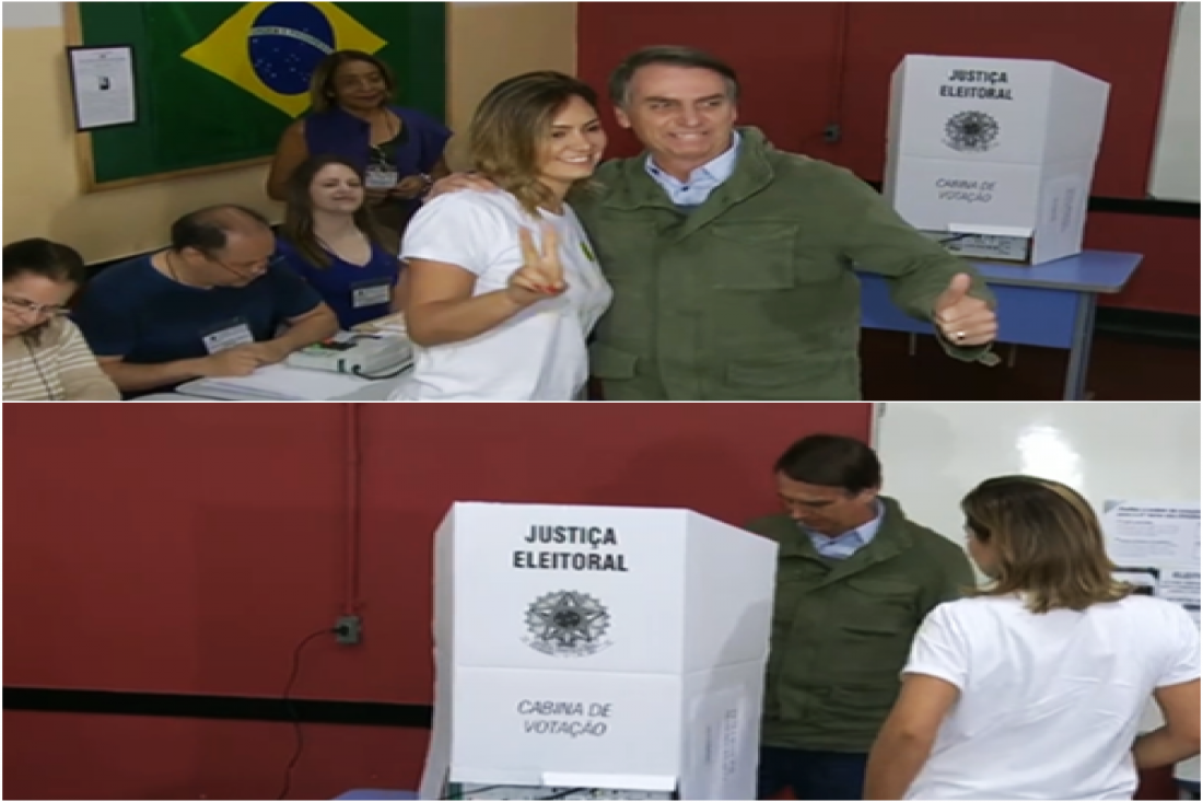 O candidato à Presidência da República pelo PSL, Jair Bolsonaro, votou pouco depois das 9h na Escola na Municipal Rosa da Fonseca, na Vila Militar, no Rio de Janeiro. Por recomendação da Polícia Federal, o candidato usou entrada alternativa, pelos fundos da escola, e colete à prova de bala. Bolsonaro chegou à seção eleitoral escoltado por policiais federais, acompanhado da esposa, Michele Bolsonaro, que estava vestida de branco. Antes de votar, o candidato beijou a mulher e fez sinal de vitória com os dedos.