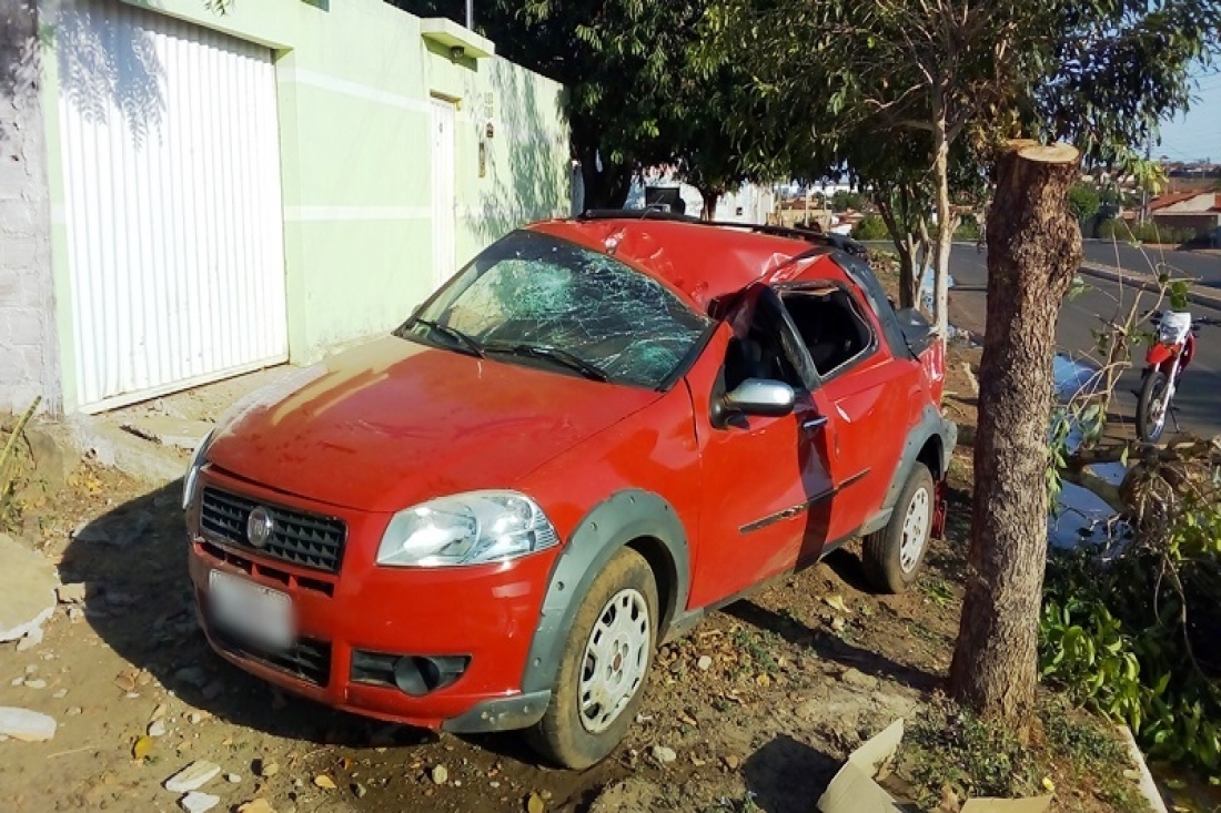 Já o veículo modelo Pick-up Strada de cor vermelha ficou completamente danificada.
