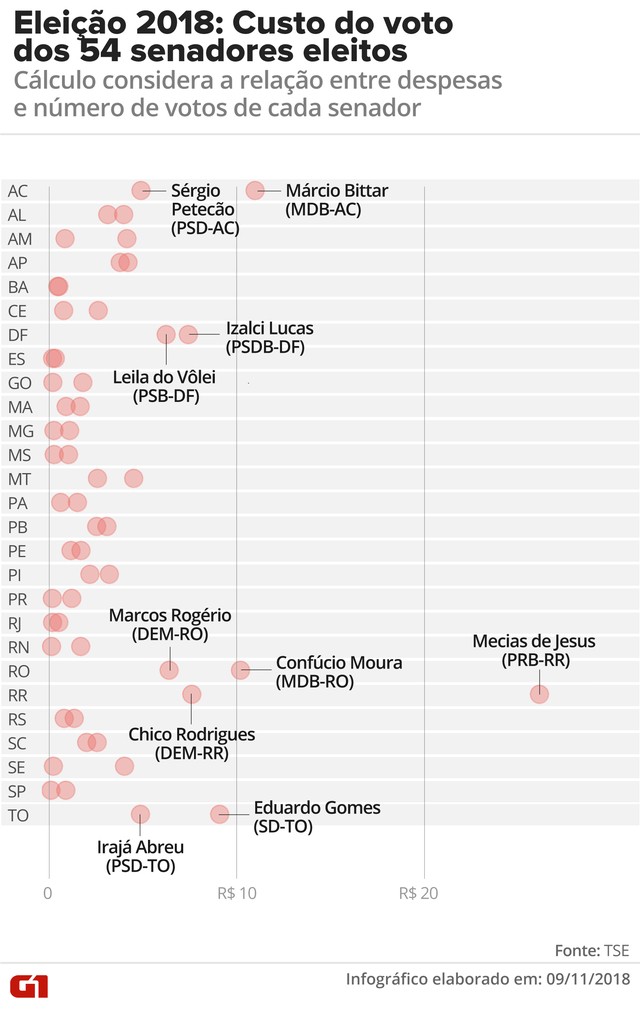 O custo do voto dos 54 senadores eleitos para compor a Casa, junto aos demais eleitos em 2014, variou de R$ 0,03 a R$ 26,21. Mecias de Jesus (PRB-RR) teve o custo do voto mais alto entre os eleitos para o Senado. Ele declarou ao TSE despesas de R$ 2,2 milhões e conquistou 85.366 votos. Cada voto do senador eleito saiu, portanto, por R$ 26,21.