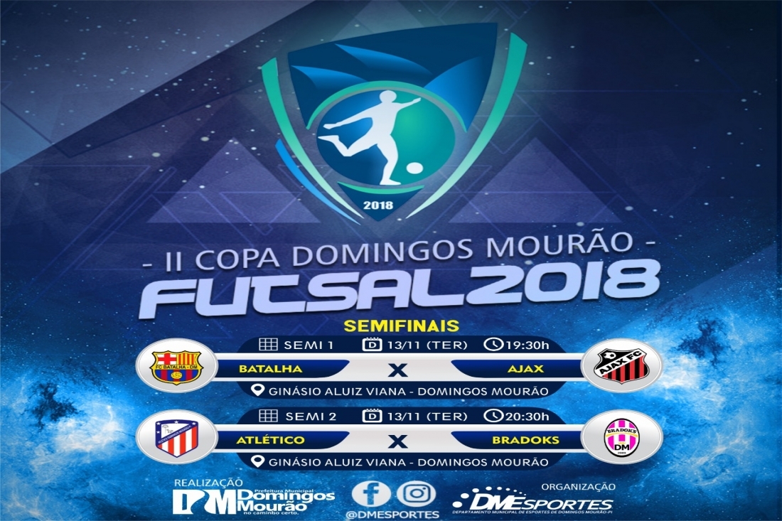 Hoje terça feira 13 de novembro as 19:30h, a bola estará em disputa pela 1ª semifinal da II Copa Domingos Mourão de Futsal 2018 competição entre as equipes da localidade Batalha e do Ajax de Cachoeirinha. Em seguida, às 20:30h, é vez de Atlético e Bradoks medirem forças para decidirem a 2ª equipe finalista.