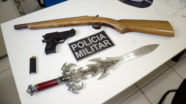 Ao atender a ocorrência, os PMs flagraram o suspeito sentado na batente de uma residência, com a espingarda artesanal, um simulacro de uma pistola e uma espada medieval de 60 cm. Ao ser abordado pelos militares, o homem não resistiu à voz de prisão.