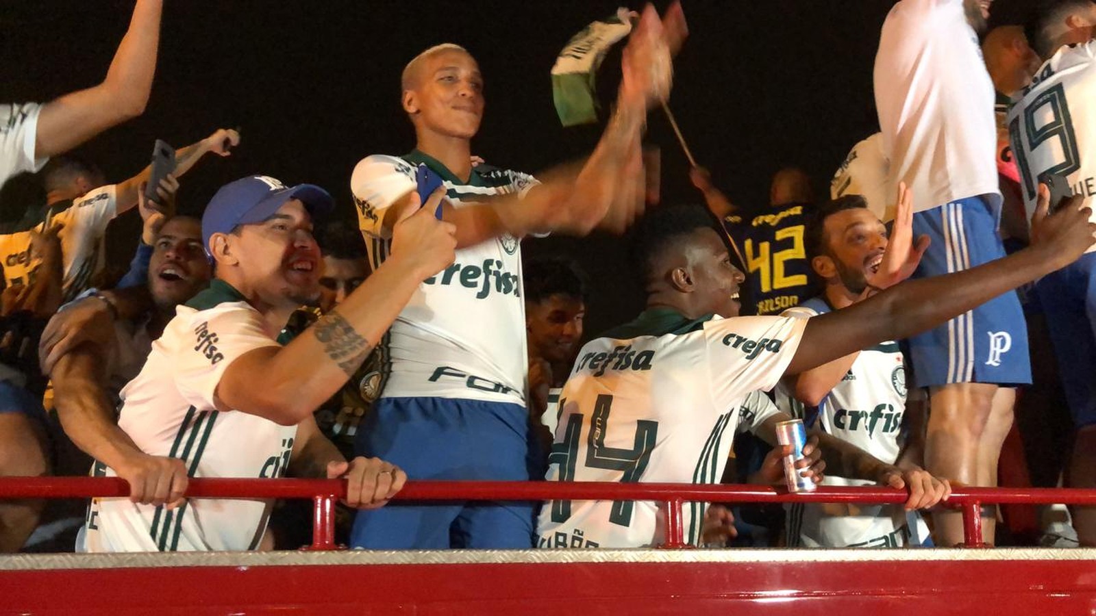 Com o entorno da Academia de Futebol tomado por palmeirenses, o elenco iniciou a madrugada de segunda-feira em cima de um trio elétrico, com destaque para os gritos de "Fica, Dudu" entoados por torcedores e companheiros de elenco – o atacante foi um dos maiores destaques na campanha do título.