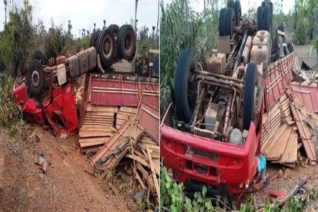 Motorista 'sobra' em curva e tomba com carga de madeira no Norte do Piauí