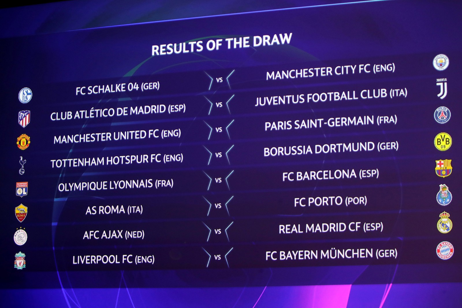 Destaque nas últimas quatro conquistas europeias do Real Madrid, Cristiano Ronaldo voltará à capital espanhola com a camisa da Juventus para enfrentar um rival conhecido: o Atlético de Madrid. O Barcelona de Messi contou com melhor sorte e terá como rival o Lyon, enquanto o Manchester City duelará contra o Schalke 04.