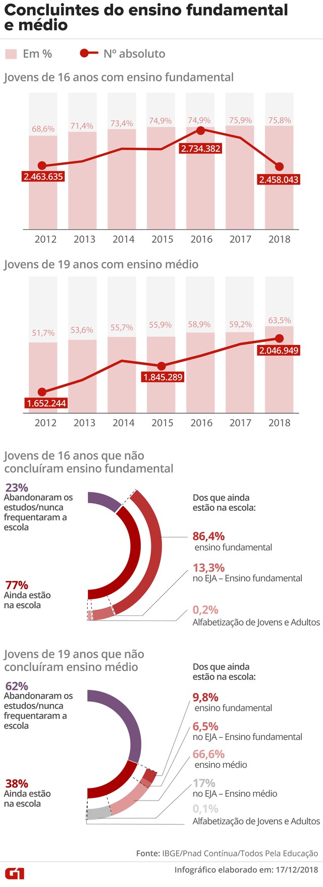 Os dados foram divulgados nesta terça-feira (18) pelo movimento Todos pela Educação, com base na Pesquisa Nacional por Amostra de Domicílios Contínua (PnadC), do Instituto Brasileiro de Geografia e Estatística (IBGE).