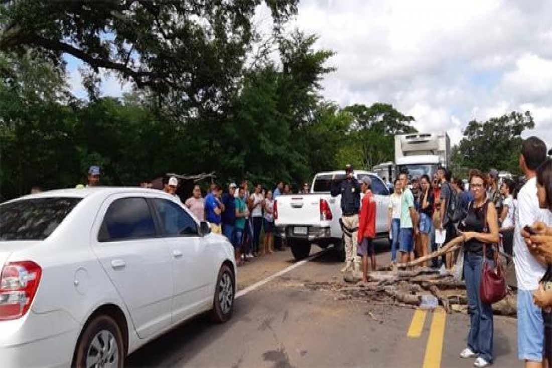 A rodovia está bloqueada com pedaços de árvores e com os próprios moradores que não saem da rodovia.