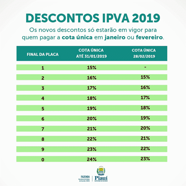 Segundo a tabela divulgada pela Secretaria de Fazenda do Piauí, os proprietários de carros com placas final 2, 3, 4, 5, 6, 7, 8, 9 e 0 que optarem por antecipar o pagamento da cota única em janeiro, terão desconto variando de 16% a 24%. Quem deixar para fevereiro, os descontos vão de 16% a 23% para veículos com placas de final 3 a 0. A partir de março, o percentual volta a ser de 15% para todos os veículos. A Sefaz ressalta que o desconto de 15% na cota única permanece para carros com placas de vencimento no mês atual, como janeiro, por exemplo.