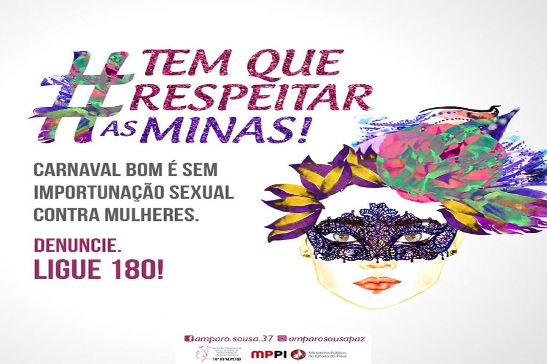 #TemQueRespeitarasMinas!, porque carnaval bom é sem importunação sexual contra as mulheres. É assim que a 10ª Promotoria de Justiça, que integra o Núcleo de Promotorias de Justiça de Defesa da Mulher Vítima de Violência Doméstica e Familiar (NUPEVID), do Ministério Público do Piauí (MPPI), lançou a campanha do Carnaval 2019, com a ideia de alertar os foliões sobre o direito que a mulher tem de se divertir em paz e da forma como ela quiser, através de mensagens ilustrativas sobre um carnaval sem importunação.