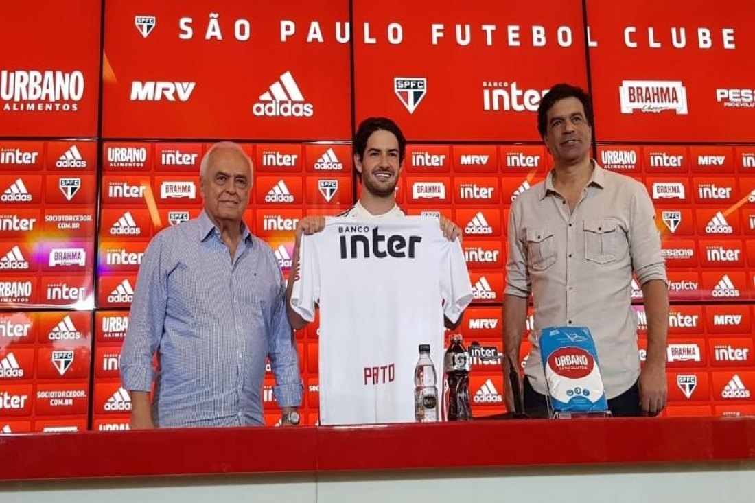 Alexandre Pato foi apresentado pela diretoria do São Paulo como reforço nesta sexta-feira, no CT da Barra Funda. Ao lado do presidente Carlos Augusto de Barros e Silva, o Leco, e do diretor executivo Raí, o atacante se declarou ao clube antes mesmo de vestir a camisa dada pelos dirigentes.