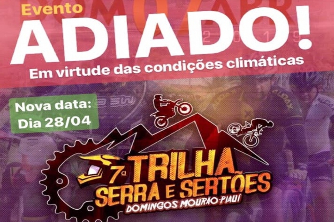 Nesta quinta feira dia (04), a comissão organizadora do evento Trilha Serra Sertões de Domingos Mourão Piauí, emitiu uma nota comunicando o adiamento do evento por conta das fortes chuvas que caem na região, adiando para o dia 28 de abril.