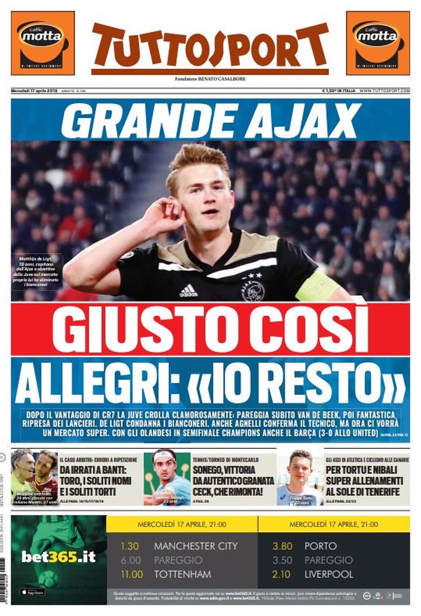 O "Tuttosport" de Turim preferiu exaltar a grande partida do Ajax na virada por 2 a 1 em Turim e deu a entender que o resultado foi justo. Além disso, destacou as palavras de Allegri e da direção bianconera bancando a permanência do técnico para a próxima temporada.