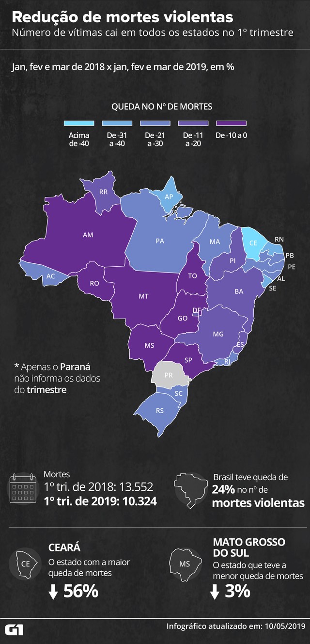 De acordo com o levantamento feito pelos repórteres do G1, houve 10.324 mortes violentas no primeiro trimestre deste ano. Apenas o Paraná não informa os dados deste intervalo de tempo. Já no mesmo período de 2018, houve 13.552 assassinatos — também desconsiderando o Paraná, para que seja feita a comparação.