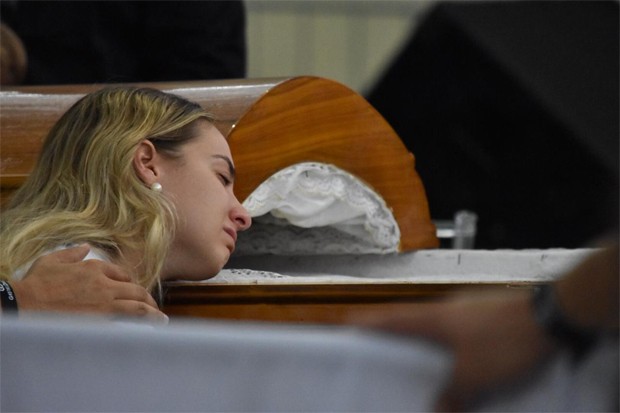 Por volta das 9h30, Karoline, visivelmente abatida, se afastou do caixão e foi amparada por um segurança.