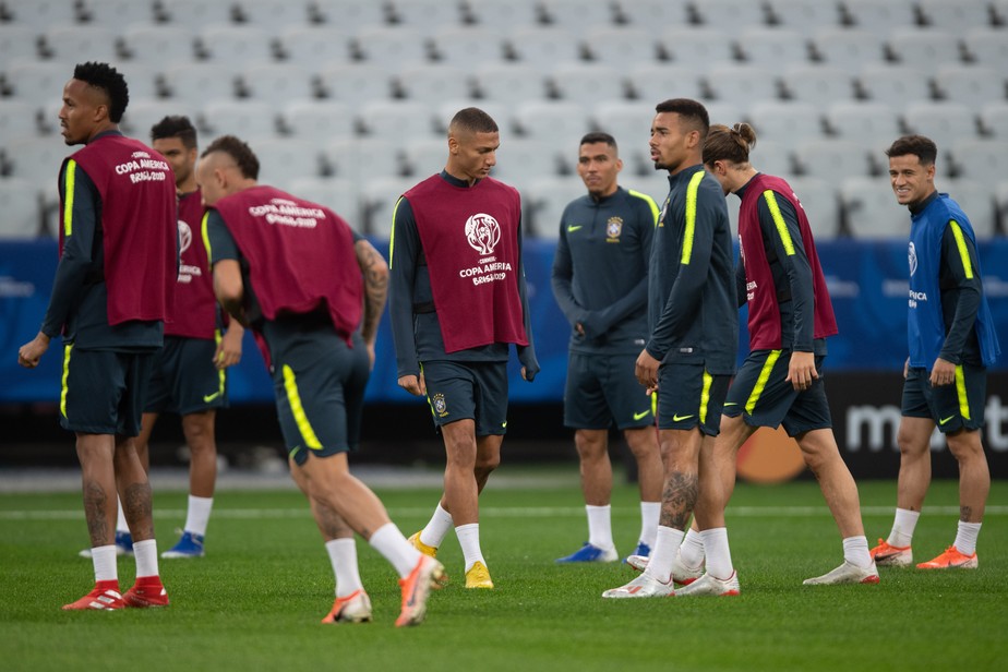 O último treino da seleção brasileira antes do jogo contra o Peru foi aberto aos jornalistas somente pelos primeiros 15 minutos. Impossível, portanto, cravar a escalação, mas a divisão de coletes indica que Gabriel Jesus e Everton têm boas chances de ganhar as vagas de Richarlison e David Neres.
