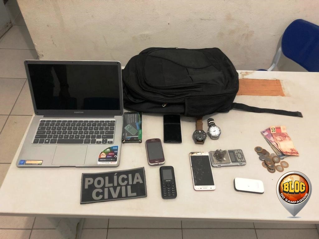 Durante o cumprir do mandado, a polícia apreendeu o notebook subtraído, celulares, pequena quantidade de maconha, uma balança de precisão, R$ 29,00 e outros objetos de origem suspeita.