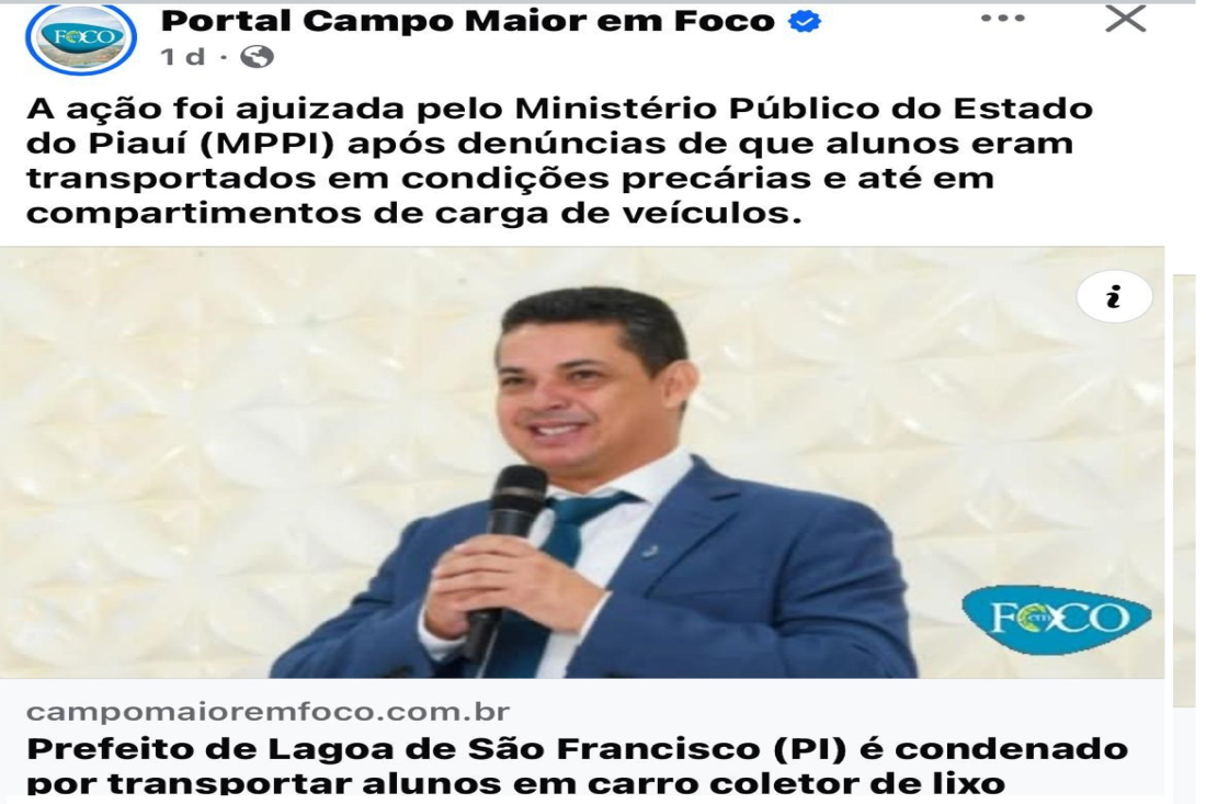 A Prefeitura de Lagoa de São Francisco esclarece que é falsa a notícia publicada em 23/08/2025 pelo portal Campo Maior em Foco, com o título: “Prefeito de Lagoa de São Francisco (PI) é condenado por transportar alunos em carro coletor de lixo”.