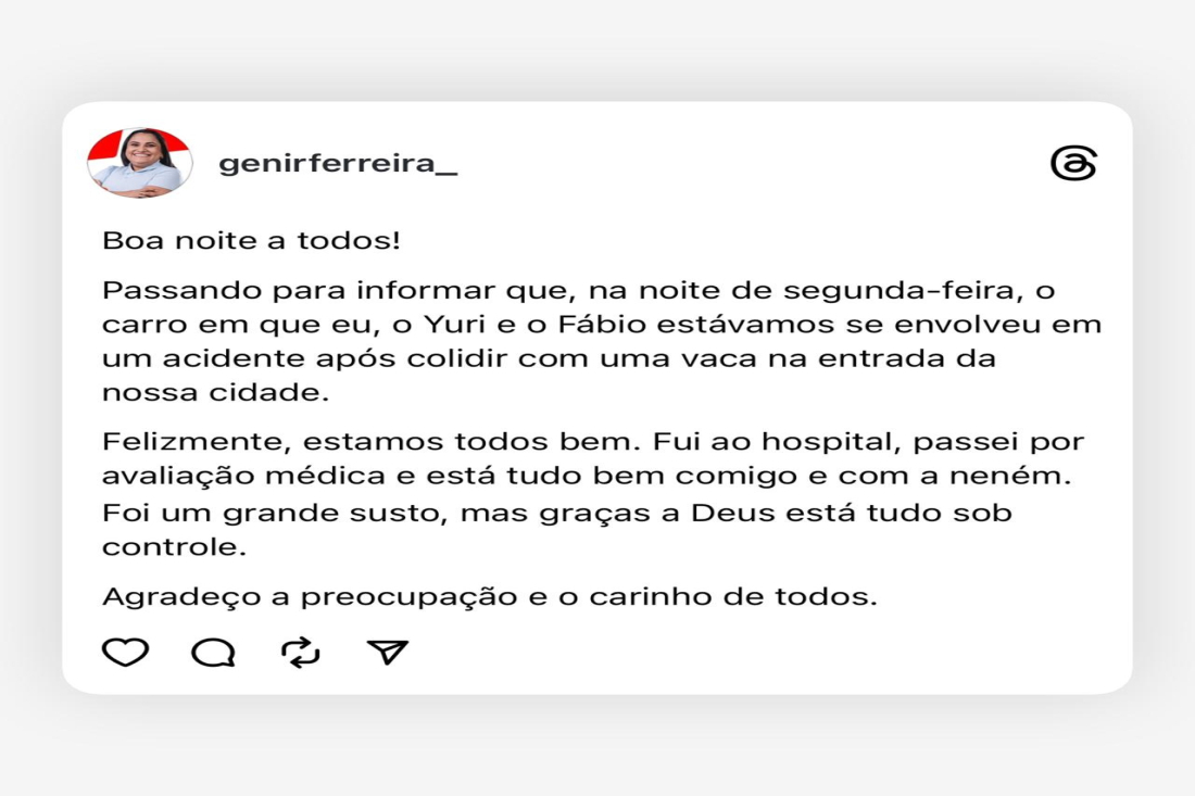 Nossa equipe apurou ainda que a prefeita não teve ferimentos, mas durante o impacto ela bateu a cabeça. O esposo e o filho também não tiveram nenhum ferimento.