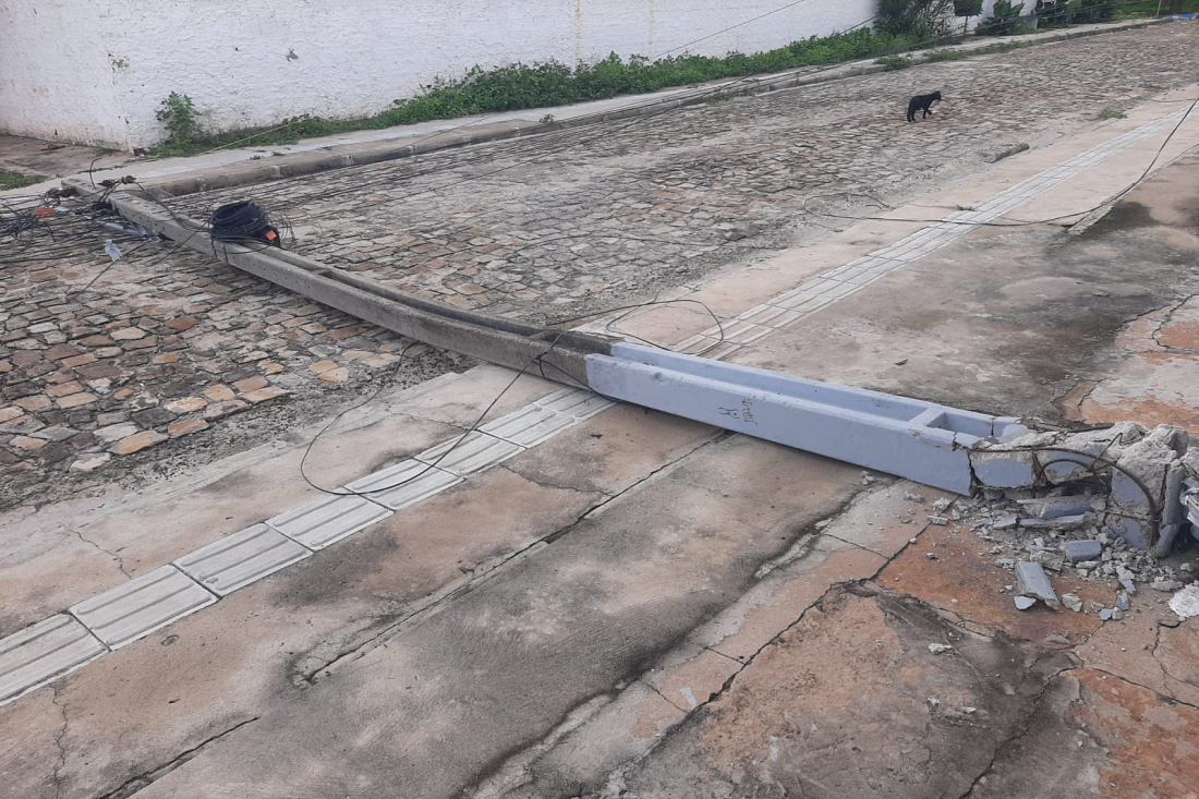Um poste de cimento que sustentava a rede elétrica caiu na tarde desta segunda-feira (06) no bairro Santa Fé, após apresentar falhas estruturais. O incidente ocorreu no cruzamento das ruas Monsenhor Uchôa e Estrela Azul.