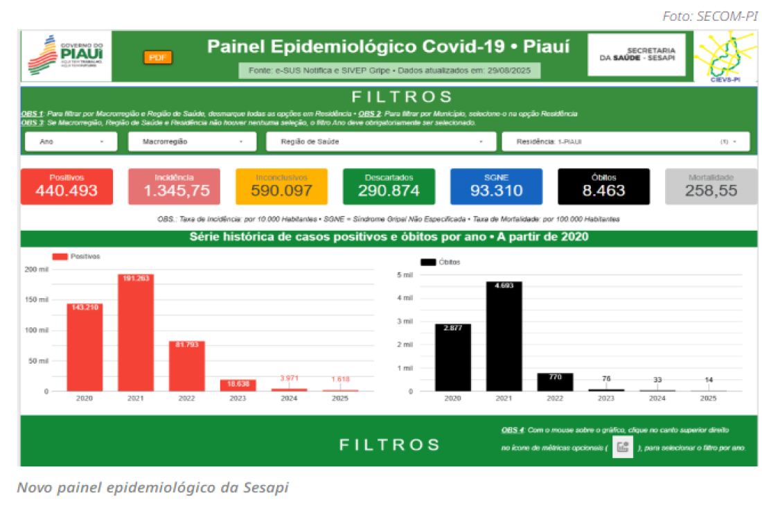 A Secretaria da Saúde do Piauí (Sesapi) apresentou, nesta semana, um novo Painel Epidemiológico da Covid-19, sistema que reúne e atualiza dados oficiais sobre a evolução da doença no estado.