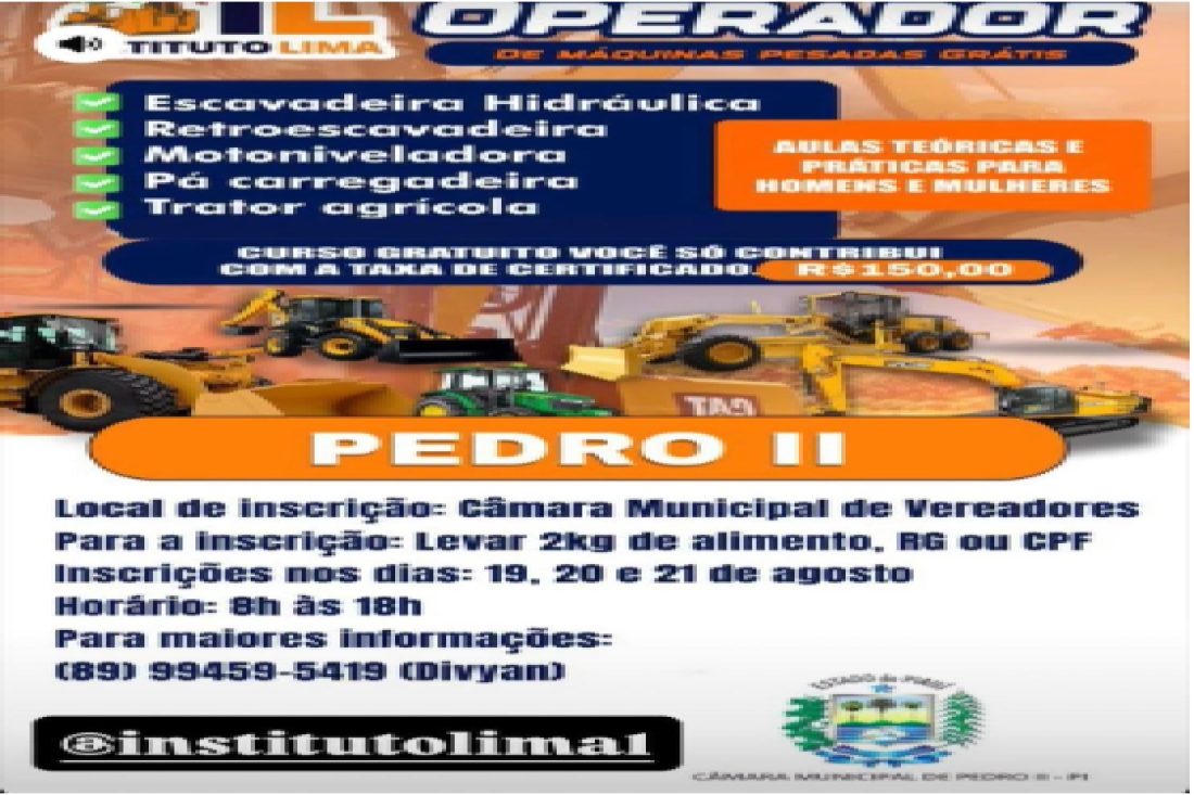 Moradores da cidade de Pedro II denunciaram um possível golpe envolvendo o Instituto Lima, empresa que se apresentou como promotora de um curso profissionalizante na área de máquinas pesadas. A empresa utilizou as instalações da Câmara Municipal de Vereadores para realizar as inscrições, nos dias 19, 20 e 21 de agosto, com atendimento das 8h às 18h.
