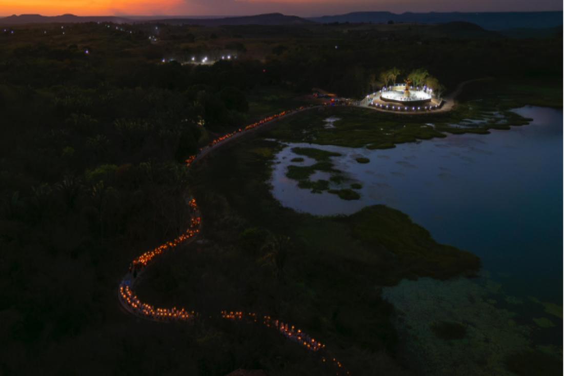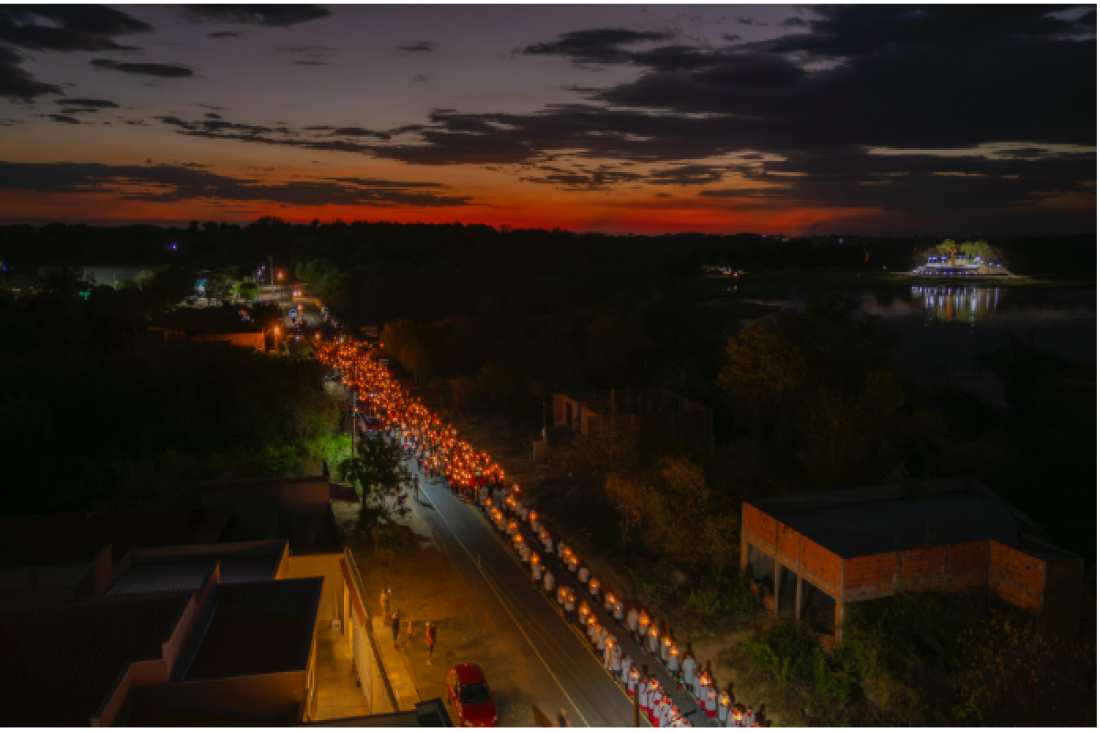 Ao cair da noite, a procissão luminosa tomou a orla da lagoa, iluminada por velas e pelo brilho da fé do povo. Caminhando em direção ao Santuário, os fiéis entoavam cânticos e orações, criando um cenário de emoção e espiritualidade que tocou o coração de todos os presentes.