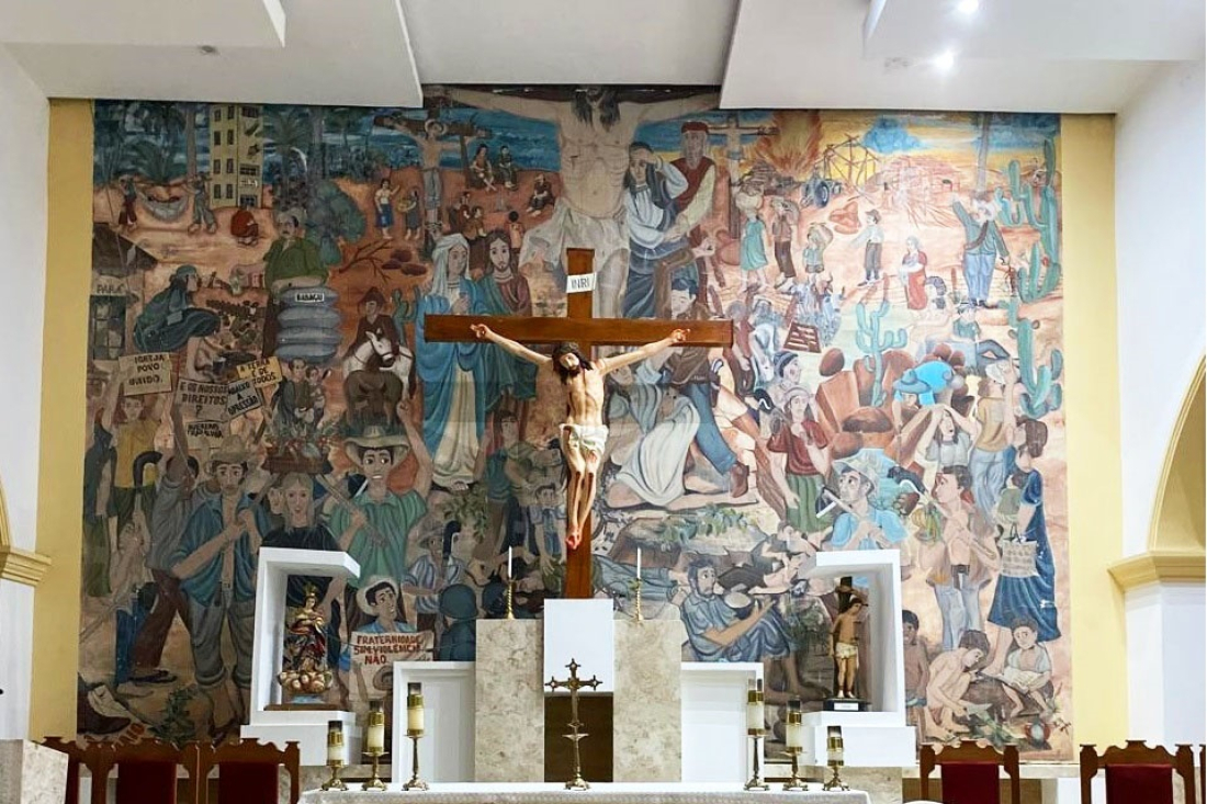 Pintado em 1983 pelo artista João Batista Bezerra da Cruz, durante a gestão do padre Ladislau, o painel retrata Jesus Cristo crucificado ao lado de manifestantes e trabalhadores, simbolizando desigualdades e tensões sociais da época. A imagem está coberta há mais de sete anos.