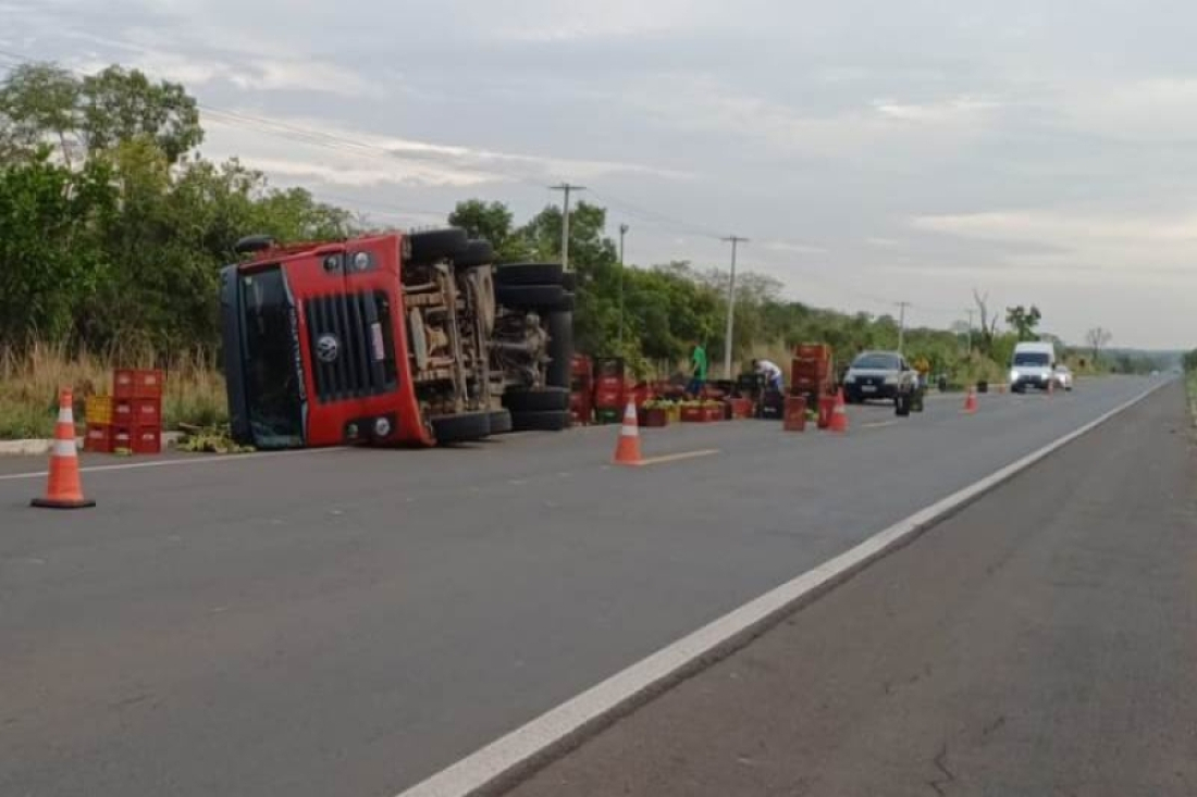 Caminhão carregado de frutas tomba na BR-343; uma pessoa ferida
