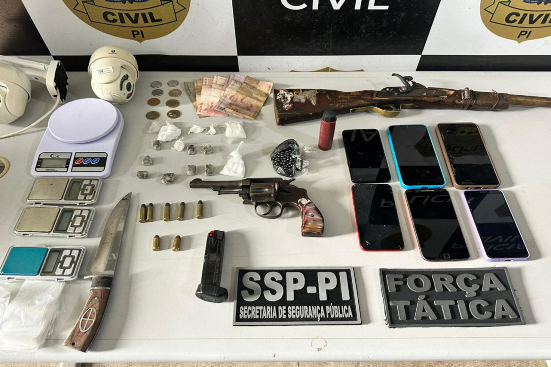 No decorrer das diligências, os policiais apreenderam entorpecentes, armas de fogo, munições, aparelhos celulares, balanças de precisão, câmeras de monitoramento e outros materiais considerados relevantes para as investigações.